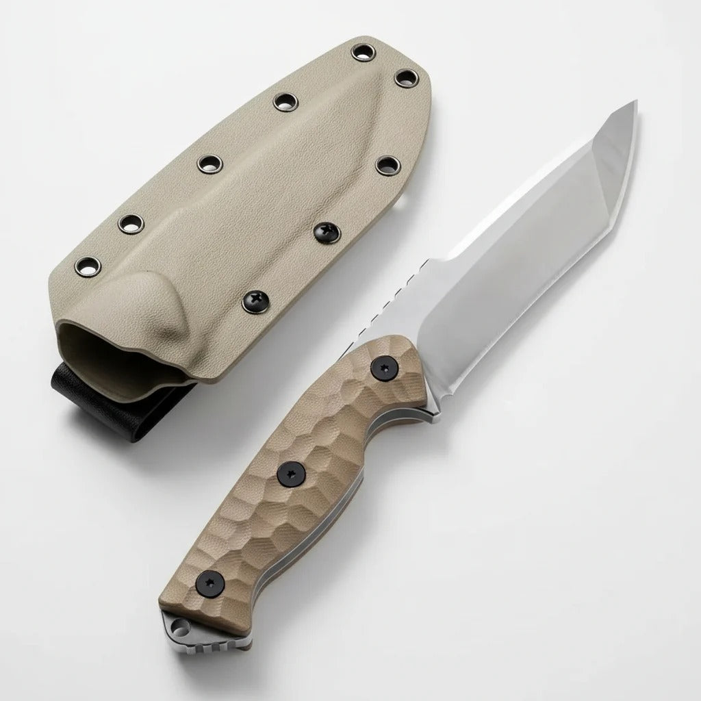The Dune Edge blade is a rugged, reliable tool built for adventurers. Featuring a sharp VG10 stainless steel blade and a striking sand-brown G10 handle, it delivers both performance and style. Perfect for camping, hiking, and survival, its full-tang design ensures strength and balance, while the ergonomic handle provides a secure, comfortable grip. The included Kydex sheath offers safe and convenient carry.