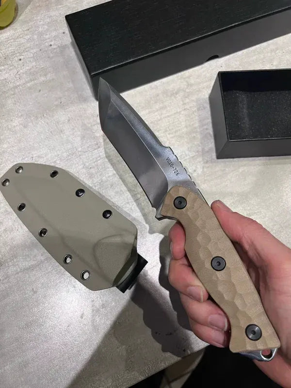 The Dune Edge Blade boasts a powerful design that blends form and function seamlessly. The sand-brown G10 handle provides a rugged, textured grip, while the sleek grey VG10 stainless steel blade exudes strength and durability. Together, they create a striking aesthetic that not only looks bold but is built to perform under the toughest conditions.